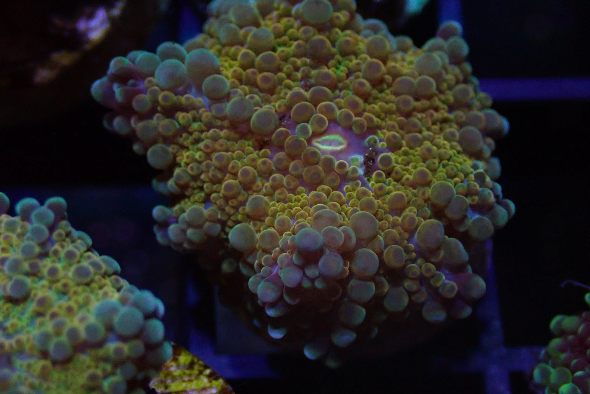 This stunning Golden Yuma is a vibrant showpiece for any reef tank. Its fleshy, bulbous polyps shimmer with radiant gold and orange tones, sometimes accented by hints of green or pink under the right lighting. Known for its bumpy texture and unique radial symmetry, this coral creates mesmerizing movement as it sways gently in the current.